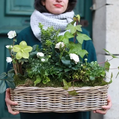 Jardinière de plantes variées et de saison dans un joli contenant en osier tressé.