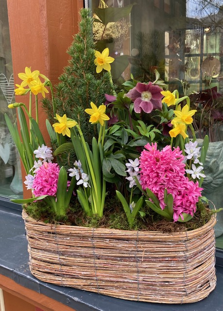 Nous sélectionnons pour vous les plus jolies plantes de saison que nous présentons dans une jardinière en rotin.